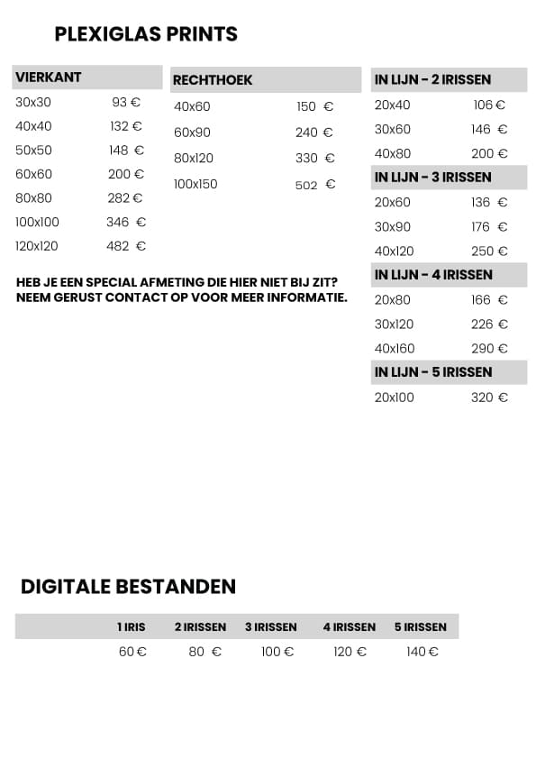 Bestel een voucher op onze website en krijg korting op een iris fotoshoot én 10% korting op een print naar keuze. Zo geef jij jouw geliefde een dierbare foto en een prachtige plexiglas print cadeau!